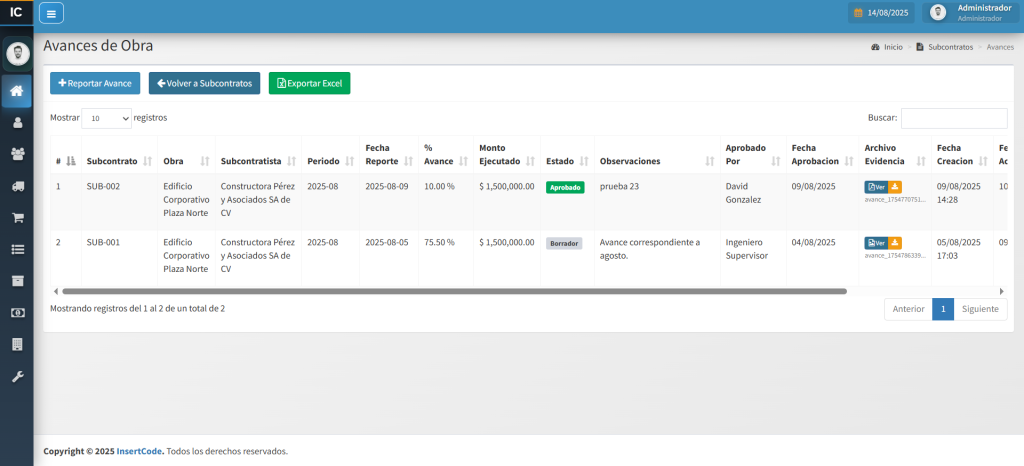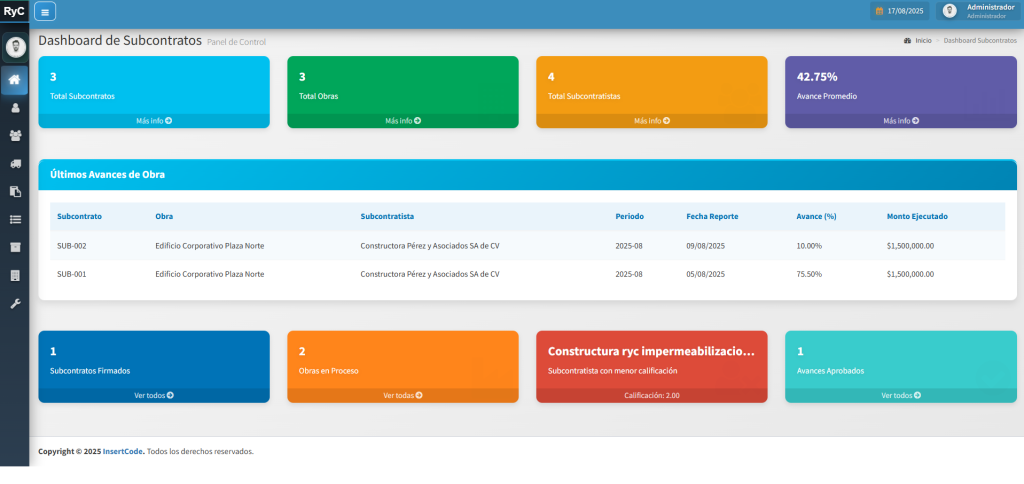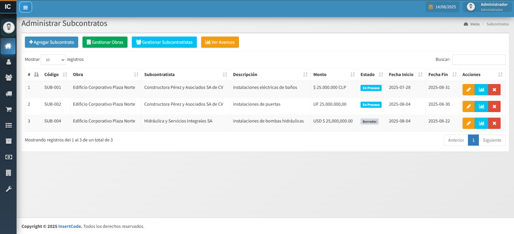 La Gestión de Subcontratos permite planificar, supervisar y controlar las actividades delegadas a terceros dentro de un proyecto. Facilita el seguimiento de plazos, costos, cumplimiento contractual y calidad del trabajo ejecutado. Ayuda a coordinar recursos y responsabilidades, evitando retrasos y conflictos. Con una gestión eficiente, se optimiza la relación con subcontratistas y se asegura el cumplimiento de los objetivos del proyecto.