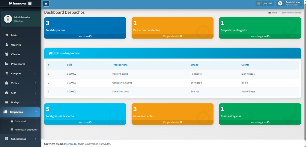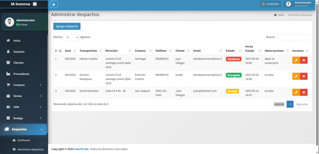 El módulo de despacho permite controlar de manera eficiente la entrega de productos desde las bodegas hacia clientes o sucursales. Facilita la generación de guías de despacho, asignación de transportistas y seguimiento de los movimientos en tiempo real. Además, integra opciones de impresión y envío por correo electrónico, asegurando trazabilidad en cada entrega. Con ello, se optimizan los tiempos logísticos, se reducen errores en la distribución y se mejora la experiencia del cliente final.