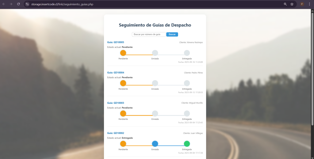 El sistema ofrece la posibilidad de visualizar en línea el seguimiento y estado de cada despacho, brindando trazabilidad completa desde la salida de bodega hasta la entrega final. Los usuarios pueden consultar en tiempo real si un despacho está pendiente, en tránsito o entregado, lo que facilita la gestión logística y mejora la comunicación con los clientes. Esta funcionalidad aporta mayor transparencia, control y confianza en el proceso de distribución.